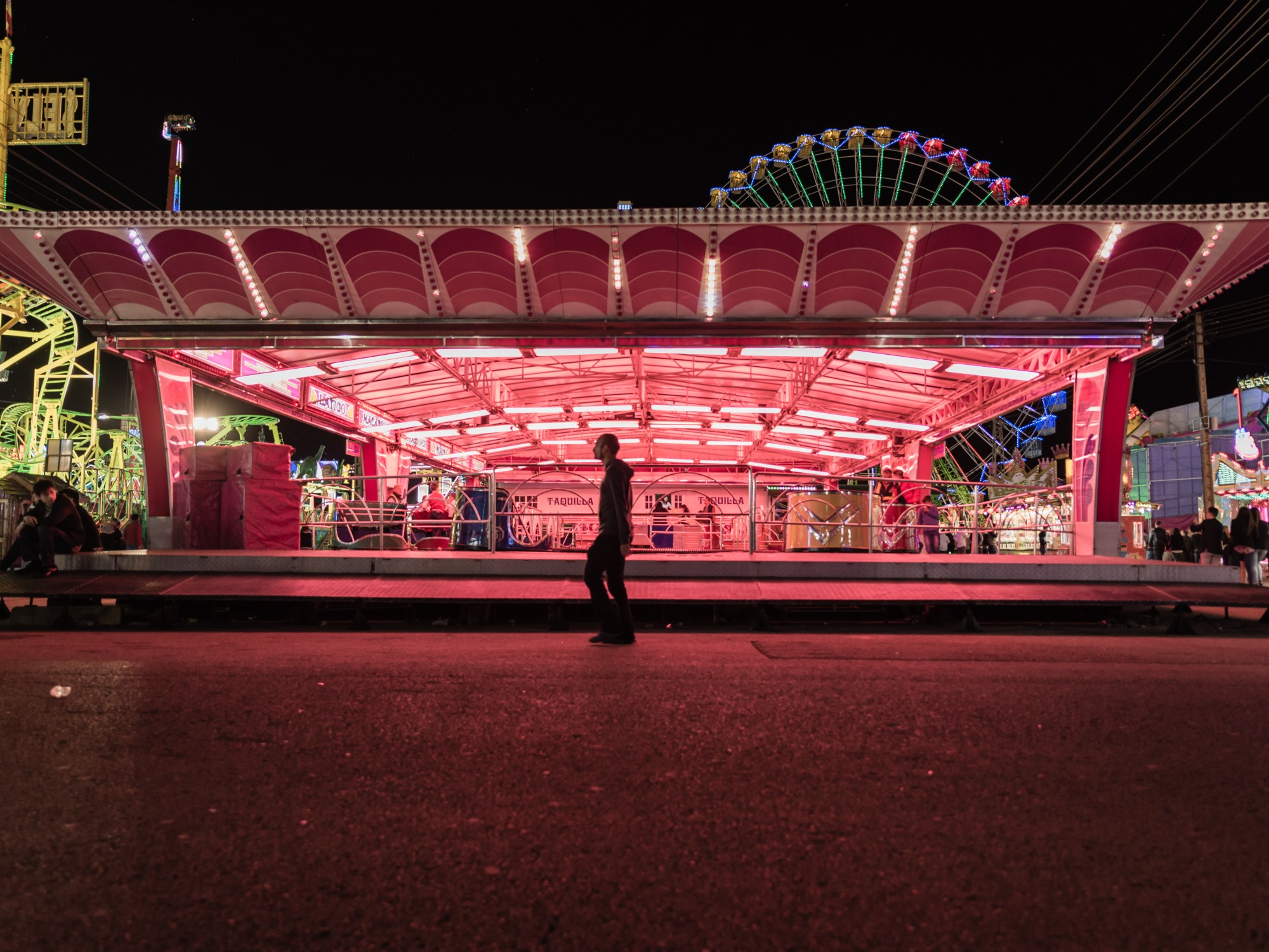 En Sevilla, al parque de atracciones que se instala en el recinto ferial durante la Feria de abril se le conoce como Calle del Infierno. Un espacio donde las instalaciones compiten unas con otras en iluminación y sonido. Cientos de atracciones con canciones del verano sonando a un volumen ensordecedor. Sin embargo, en fotografía ese clima solo se consigue con el movimiento. Y precisamente en este trabajo he procurado justo lo contrario, vaciar el objetivo para lograr una imagen de calma inédita en el Real de la Feria.